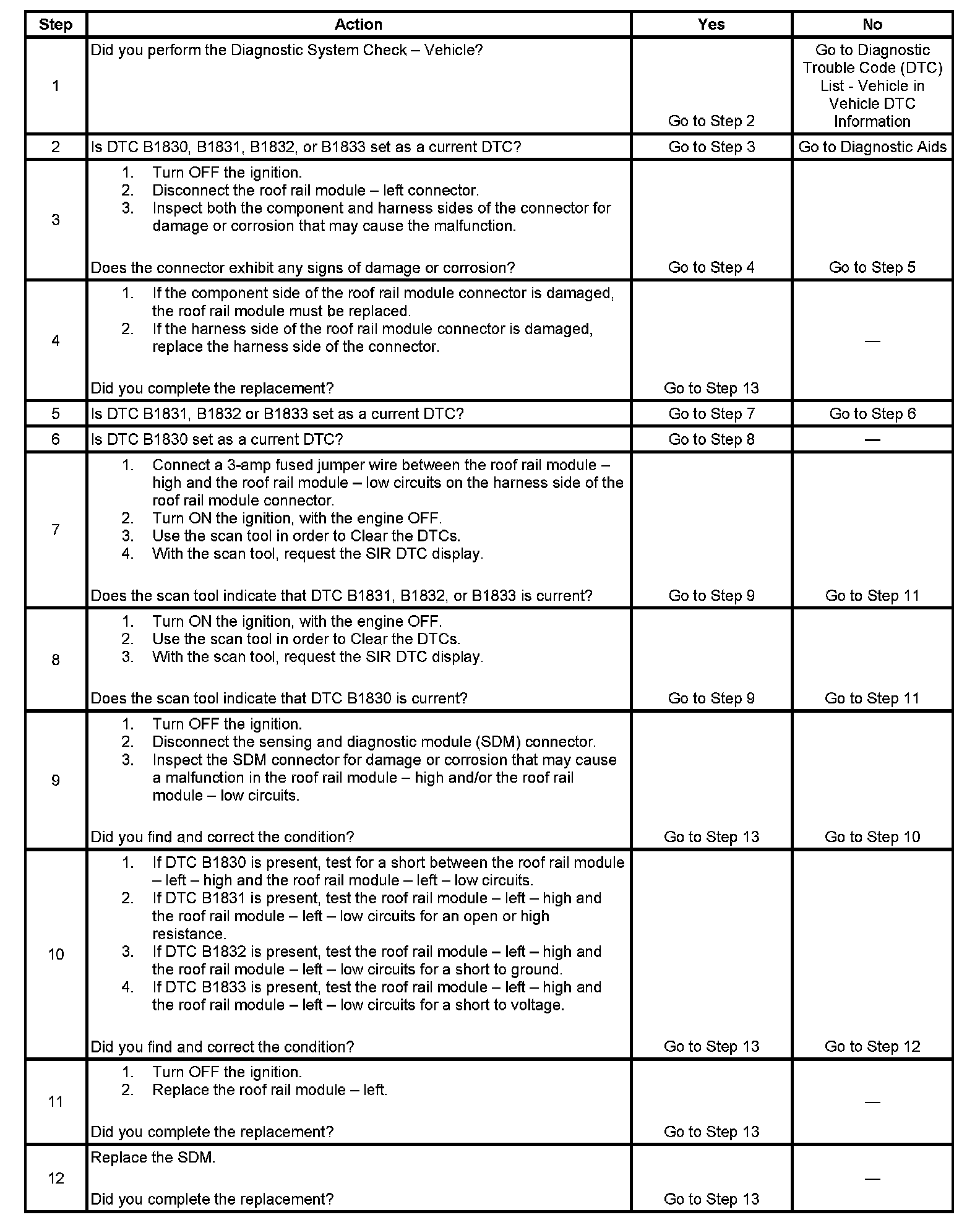 - DTC B1830 will set when the SDM detects a low resistance condition in the roof rail module - left deployment loop.