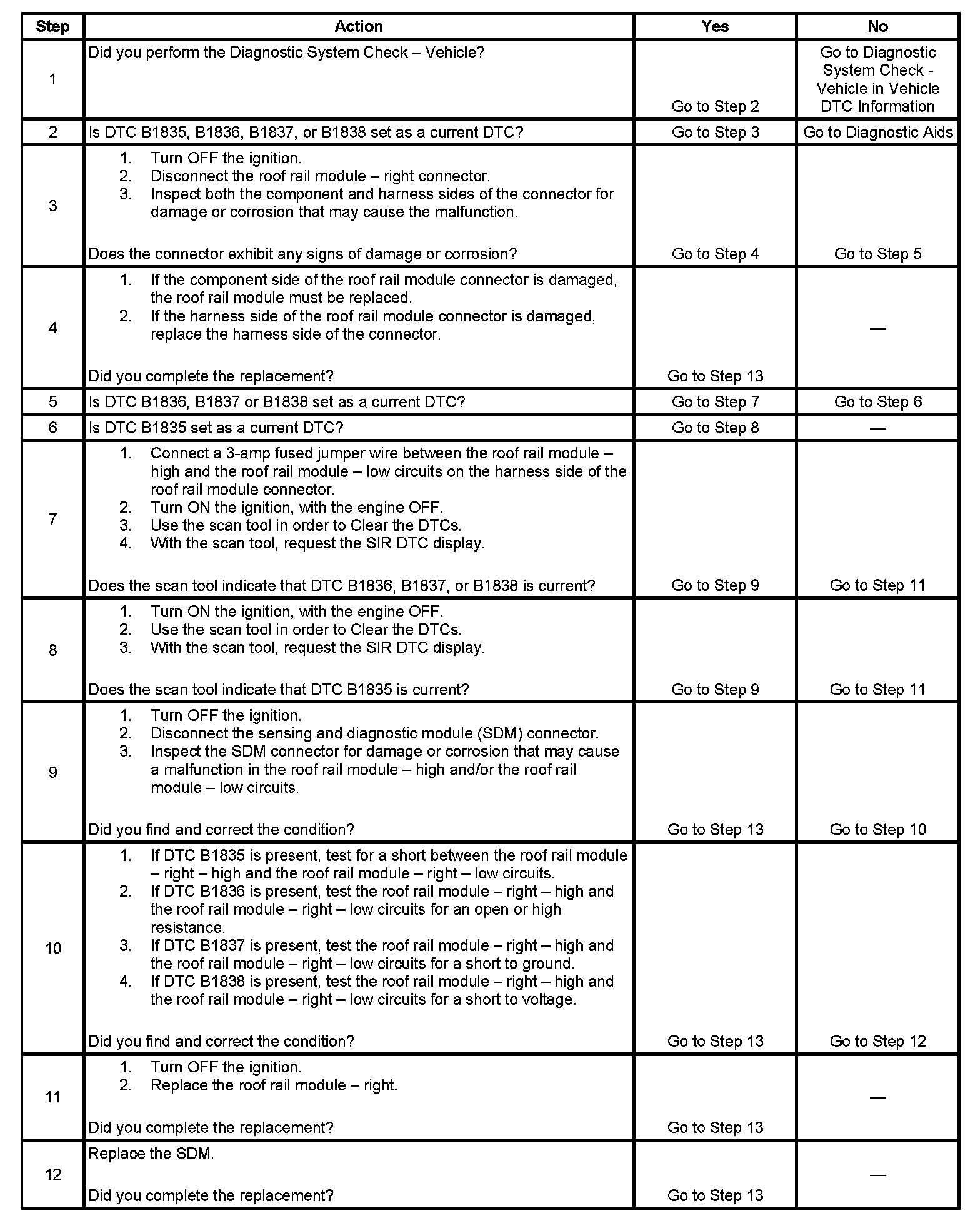 - DTC B1835 will set when the SDM detects a low resistance condition in the roof rail module - right deployment loop.