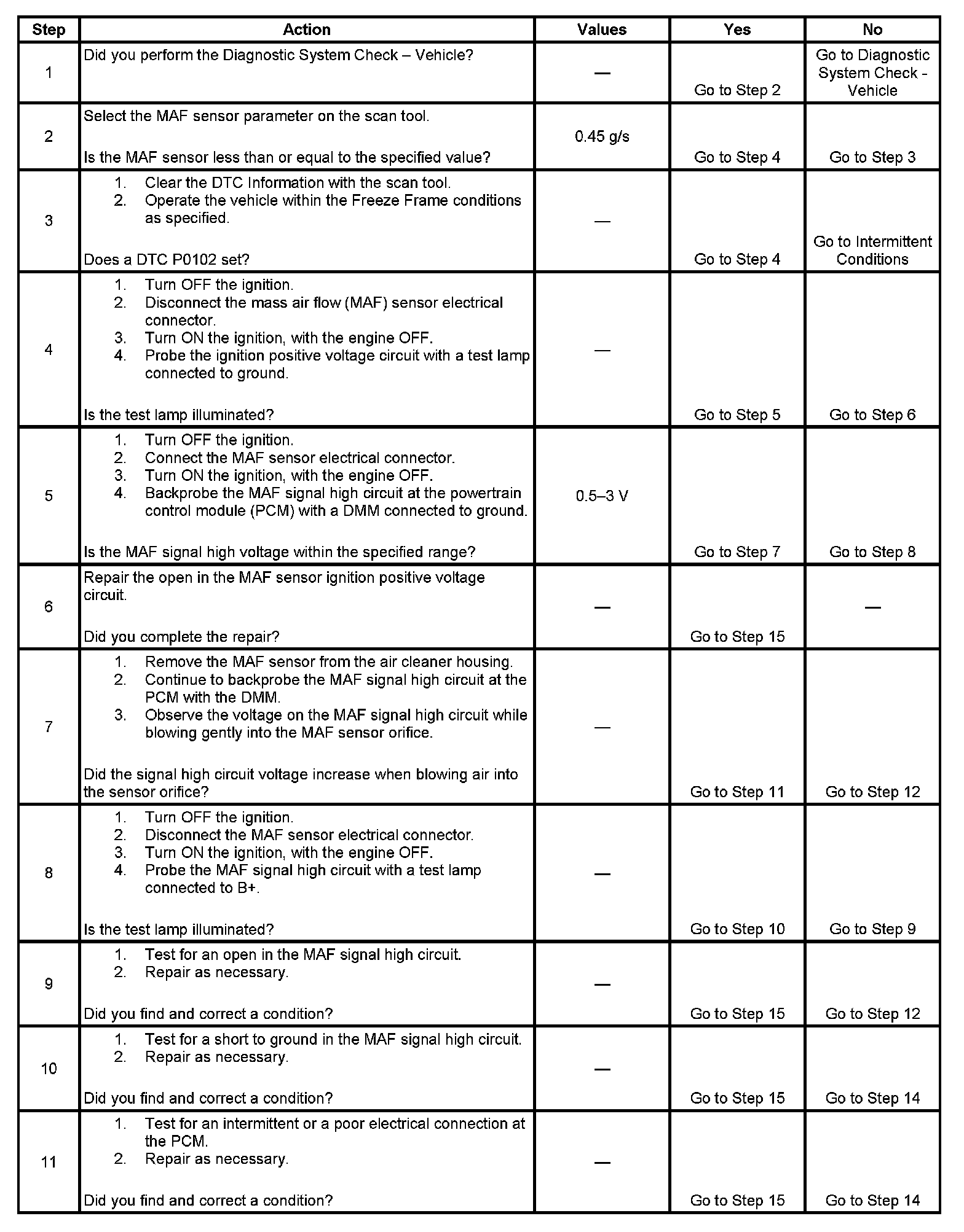 The DTC P0102 Mass Air Flow (MAF) Sensor Circuit Low Voltage diagnostic detects an out of range sensor signal. The MAF sensor measures the changes in the intake air volume that result from the changes in throttle opening and air density. Air flow measurements are used by the powertrain control module (PCM) in order to determine engine fueling requirements.