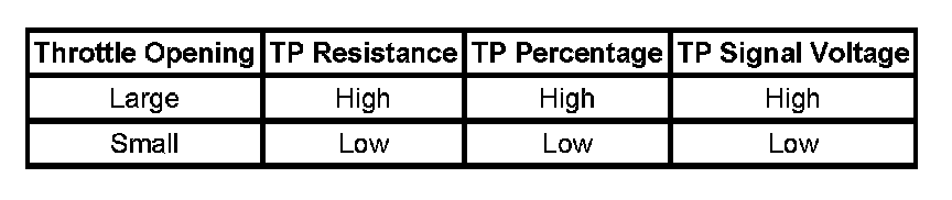 The DTC P0121 Throttle Position (TP) Sensor Performance diagnostic monitors the sensor activity. The TP sensor is a potentiometer whose resistance value changes along with the throttle valve position. The powertrain control module (PCM) provides a 5-Volt reference voltage to the TP sensor. The PCM reads the voltage across the TP sensor and uses the voltage to calculate the percentage of throttle valve opening. The TP sensor resistance decreases as the throttle valve opening increases. When the TP sensor resistance decreases the voltage being monitored by the PCM increases. The TP sensor resistance increases when the throttle valve opening decreases, therefore the voltage being monitored by the PCM will decrease.