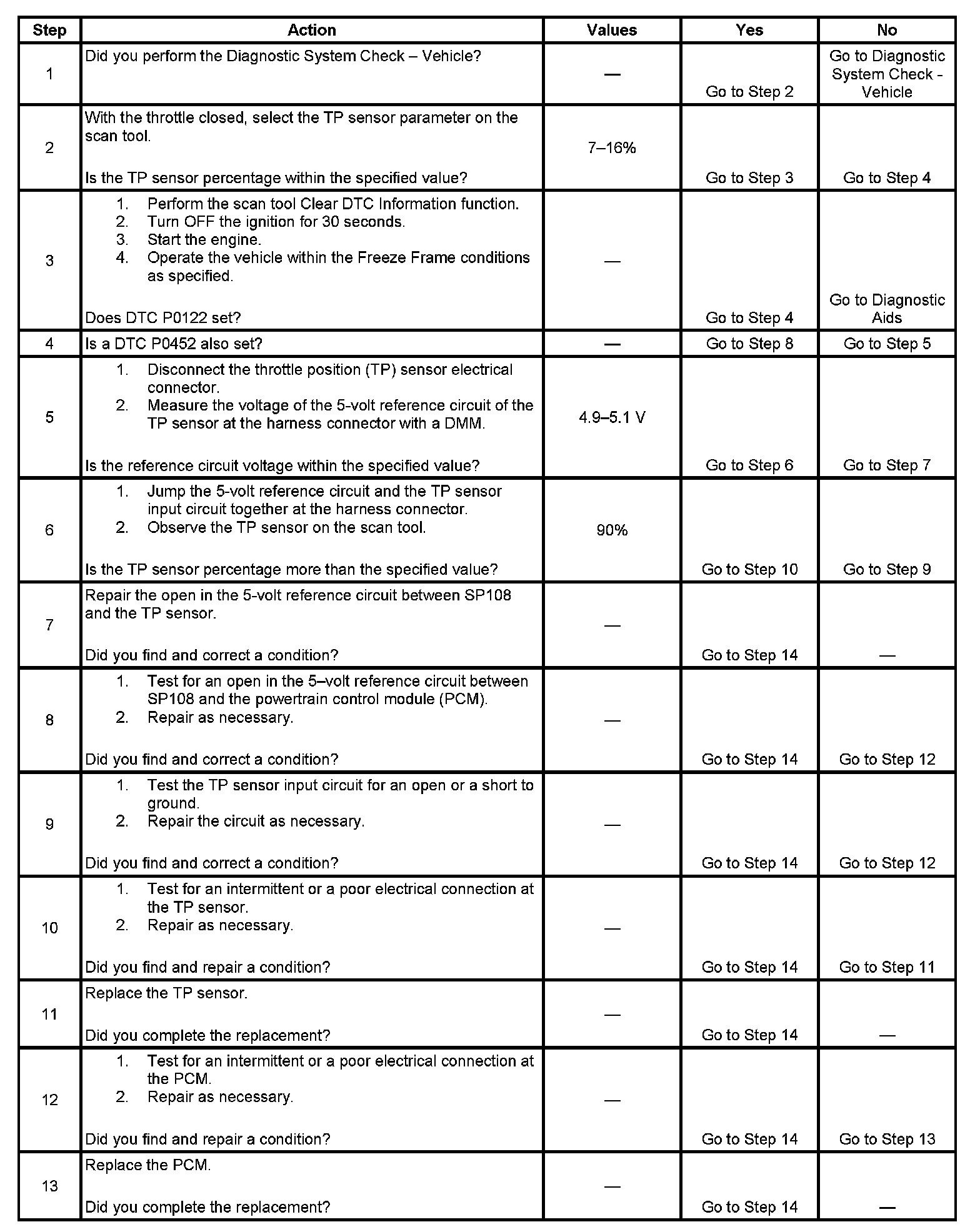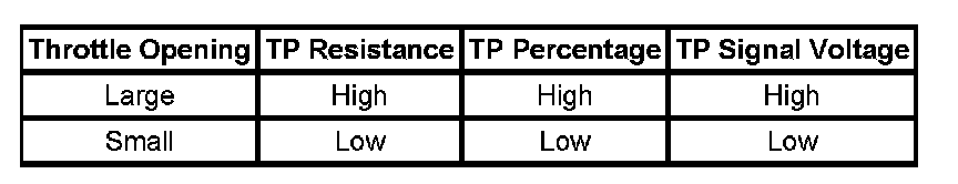The DTC P0122 Throttle Position (TP) Sensor Circuit Low Voltage diagnostic detects an out of range sensor signal. The TP sensor is a potentiometer whose resistance value changes along with the throttle valve position. The powertrain control module (PCM) provides a 5-Volt reference voltage to the TP sensor. The PCM reads the voltage across the TP sensor and uses the voltage to calculate the percentage of throttle valve opening. The TP sensor resistance decreases as the throttle valve opening increases. When the TP sensor resistance decreases the voltage being monitored by the PCM increases. The TP sensor resistance increases when the throttle valve opening decreases, therefore the voltage being monitored by the PCM will decrease.