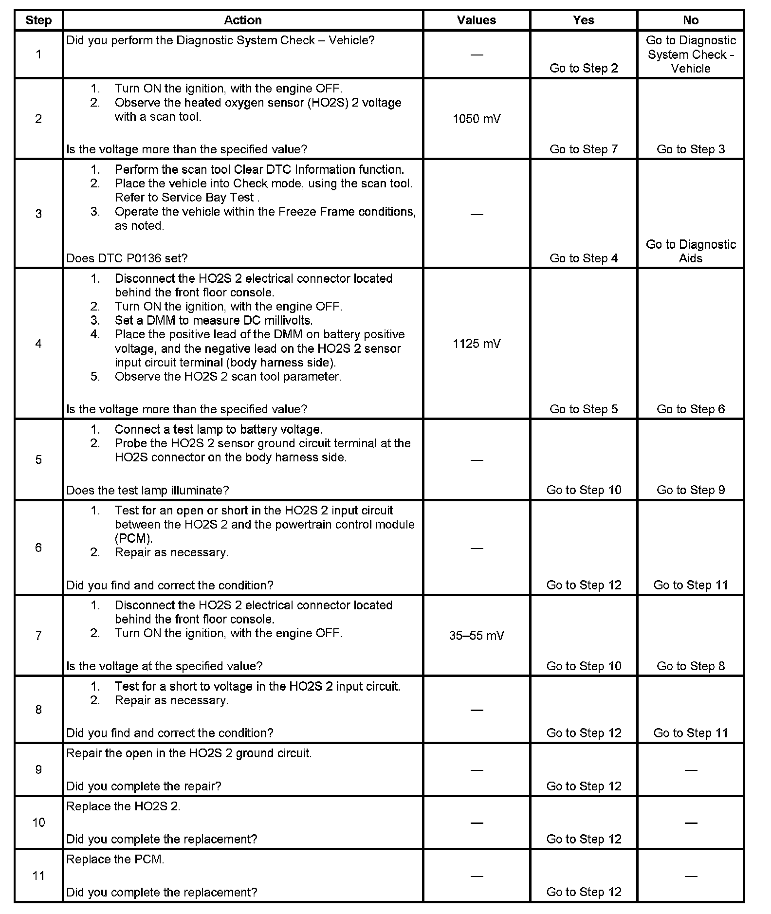 - If a DTC P0136 is intermittent, driving the vehicle under the conditions outlined in the Inspection/Maintenance (I/M) section can verify whether the fault is present. Refer to Inspection/Maintenance (I/M) Heated Oxygen Sensor/Oxygen Sensor (HO2S/O2S) System Set Procedure. Heated Oxygen Sensor/Oxygen Sensor (HO2S/O2S) System Set Procedure
