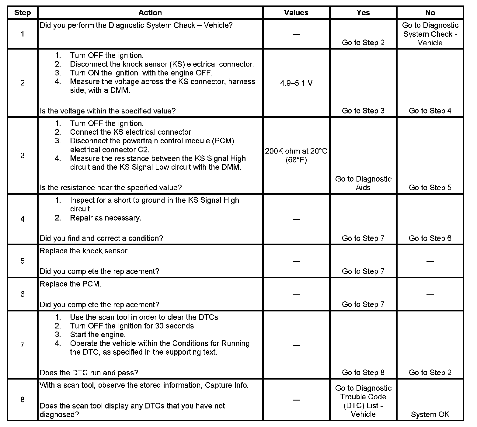 The DTC P0327 Knock Sensor (KS) Circuit Low Frequency diagnostic monitors the activity on the knock sensor circuit. The KS is non-resonant design that is constructed of a piezoelectric element which generates an AC signal when vibrated. Normal engine operation will cause the KS to generate signals of known frequencies. When engine knock is present, the KS frequency changes. This signals the powertrain control module (PCM) to retard ignition timing. The PCM sends a bias voltage of 5 volts to the KS on the KS Signal High circuit. The PCM expects approximately 2.5 volts back on the KS Signal Low circuit. The KS generated AC signal rides on top of the bias voltage provided by the PCM. For additional information on the operation of the KS refer to Knock Sensor (KS) System Description.