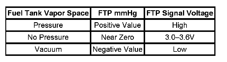 2. This step determines if a FTP sensor malfunction is present. The input signal of the FTP sensor should indicate atmospheric pressure with the fuel tank filler cap removed. The fuel tank pressure sensor voltage will vary with atmospheric pressure. A typical FTP reading at sea level is between 3.5-3.8 volts.