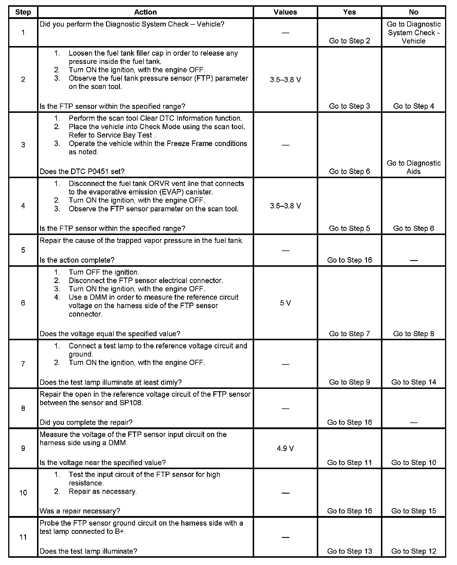 The DTC P0451 Fuel Tank Pressure (FTP) Sensor Performance diagnostic checks the accuracy of the FTP sensor signal. The evaporative emission (EVAP) control system prevents the emission of the fuel vapors. The fuel vapor generated in the fuel tank while driving or idling enters the EVAP canister where a charcoal element absorbs and stores the fuel vapor. When certain engine operating conditions are met the powertrain control module (PCM) purges the EVAP canister of stored vapors by turning ON the EVAP canister purge valve.