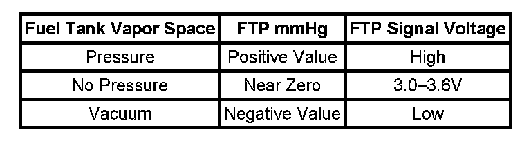 Emissions laws require that the PCM detect any leakage within the EVAP system. The PCM monitors the EVAP system for leaks by controlling and observing the vapor pressures in the EVAP system. The FTP sensor is used to detect any unexpected pressure in the EVAP system. The PCM supplies a 5-Volt reference and an electrical ground to the FTP sensor. The FTP sensor contains a silicon based chip that changes electrical resistance when pressure is applied. The sensor converts the positive or the negative pressure into an electrical signal and sends the signal to the PCM.