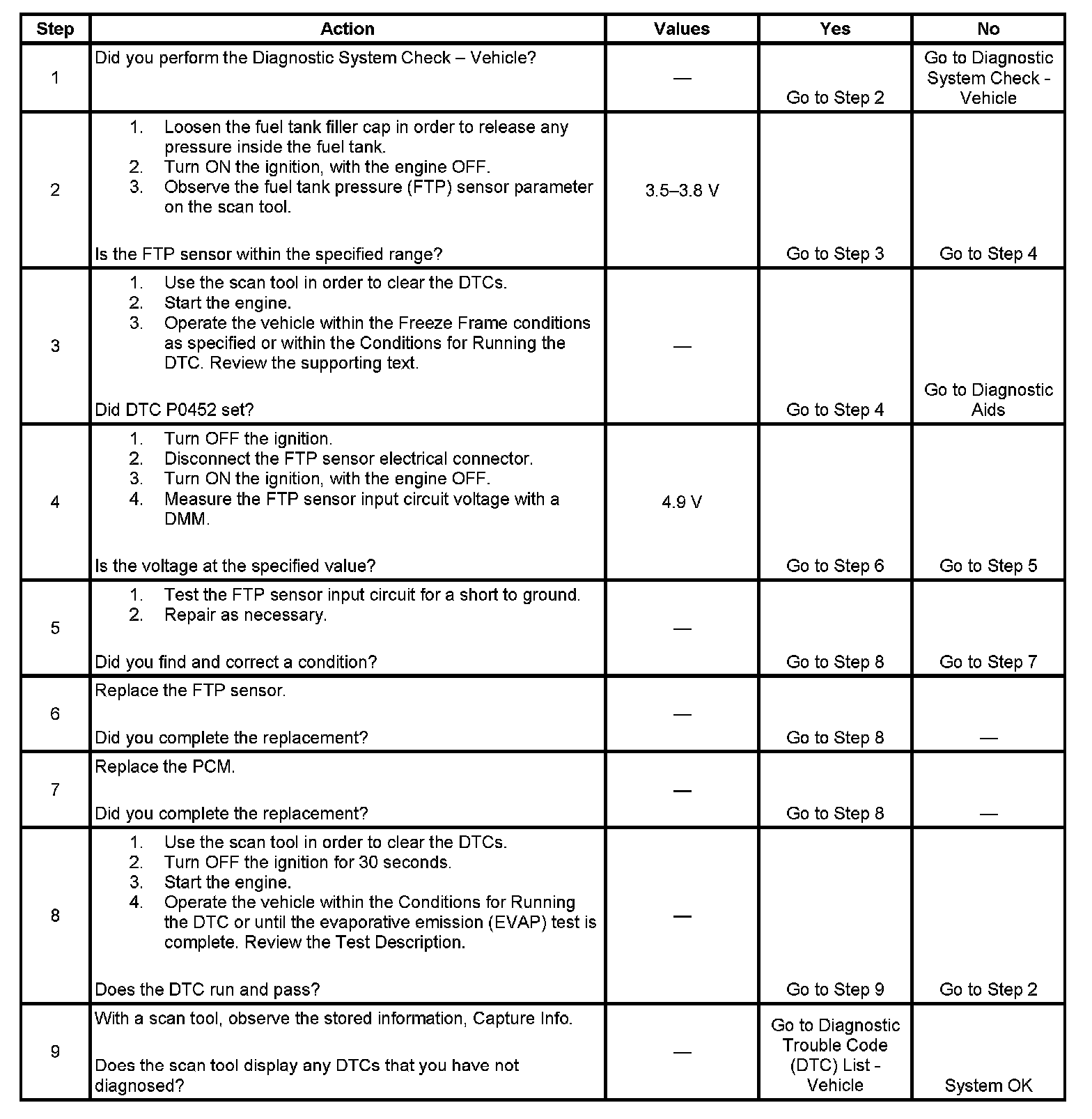 - If a DTC P0452 is intermittent, road test the vehicle while observing the fuel tank pressure sensor with a scan tool. A momentary reading of less than 0.20 volts may indicate an intermittent short to ground in the sensor input circuit.
