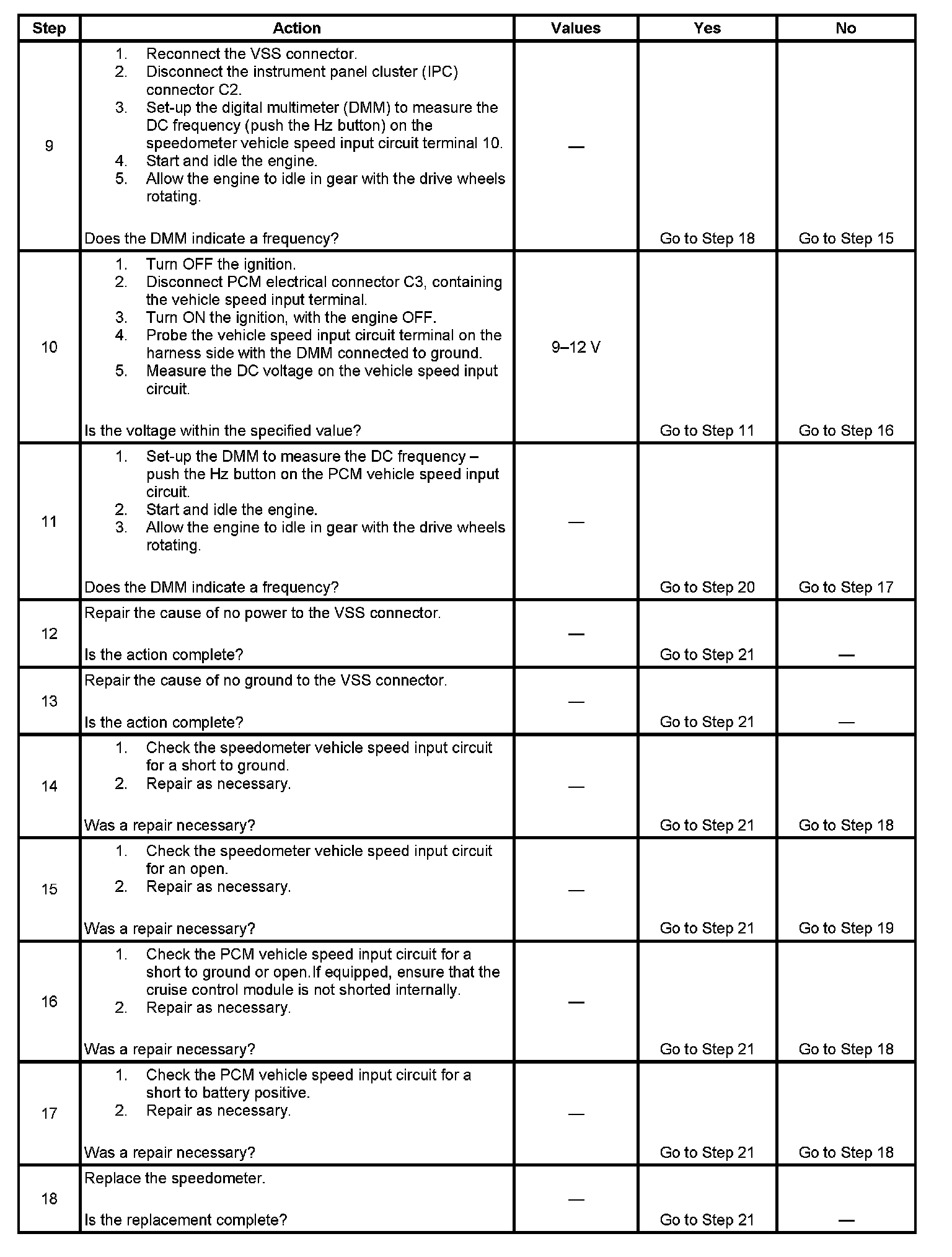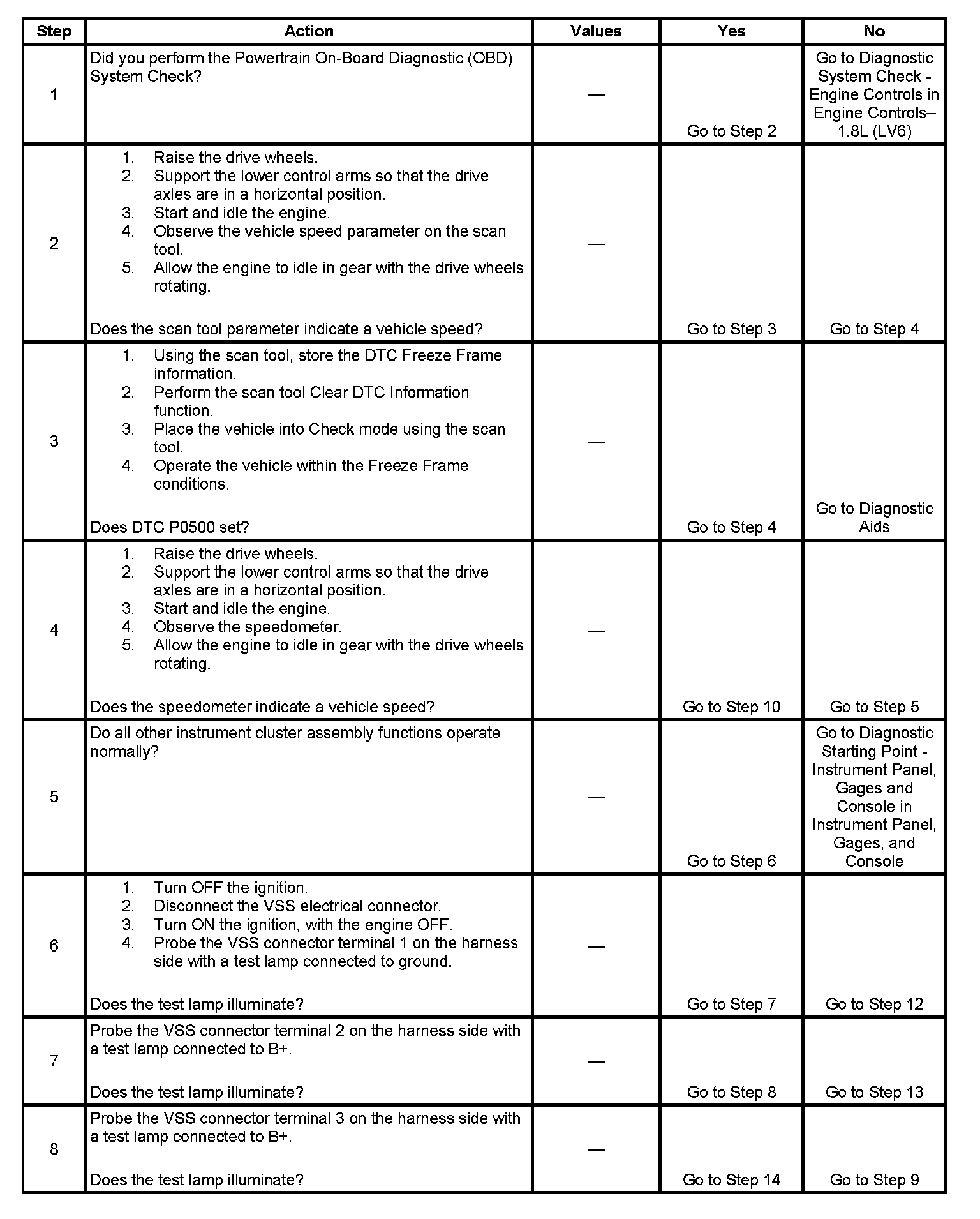 8. This step checks for a shorted to ground speedometer vehicle speed input circuit.