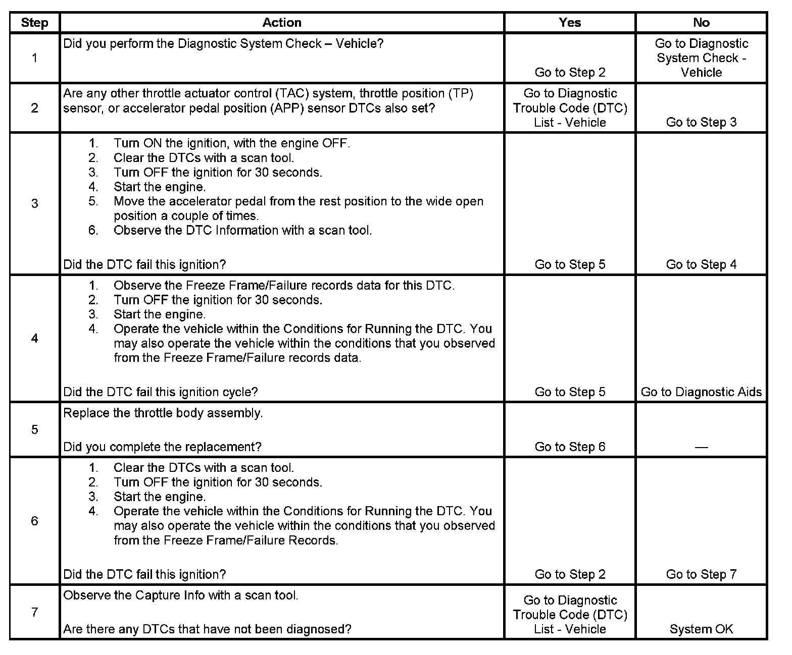 The throttle valve in the throttle body utilizes a throttle return spring to assist in positioning the throttle valve at a resting or default position. The powertrain control module (PCM) uses driver input from the accelerator pedal position (APP) sensor in order to calculate the desired throttle position. The PCM sends the desired throttle position or target value to the throttle actuator control (TAC) module. The TAC module achieves the desired throttle position by commanding the throttle control motor to position the throttle valve at the target value. The TAC module then compares the throttle position (TP) sensor 1 value to the target value. If necessary, the throttle control motor is moved slightly in order to obtain the exact target value position. If the TP sensor indicates that the throttle valve has failed to reach multiple target positions, a DTC P2119 sets. For additional information on the operation of the TAC system, refer to Throttle Actuator Control (TAC) System Description.