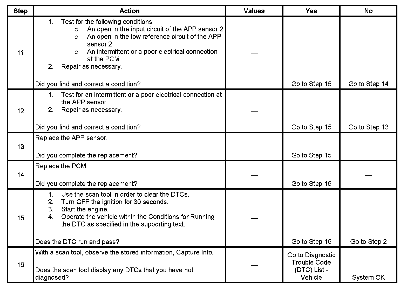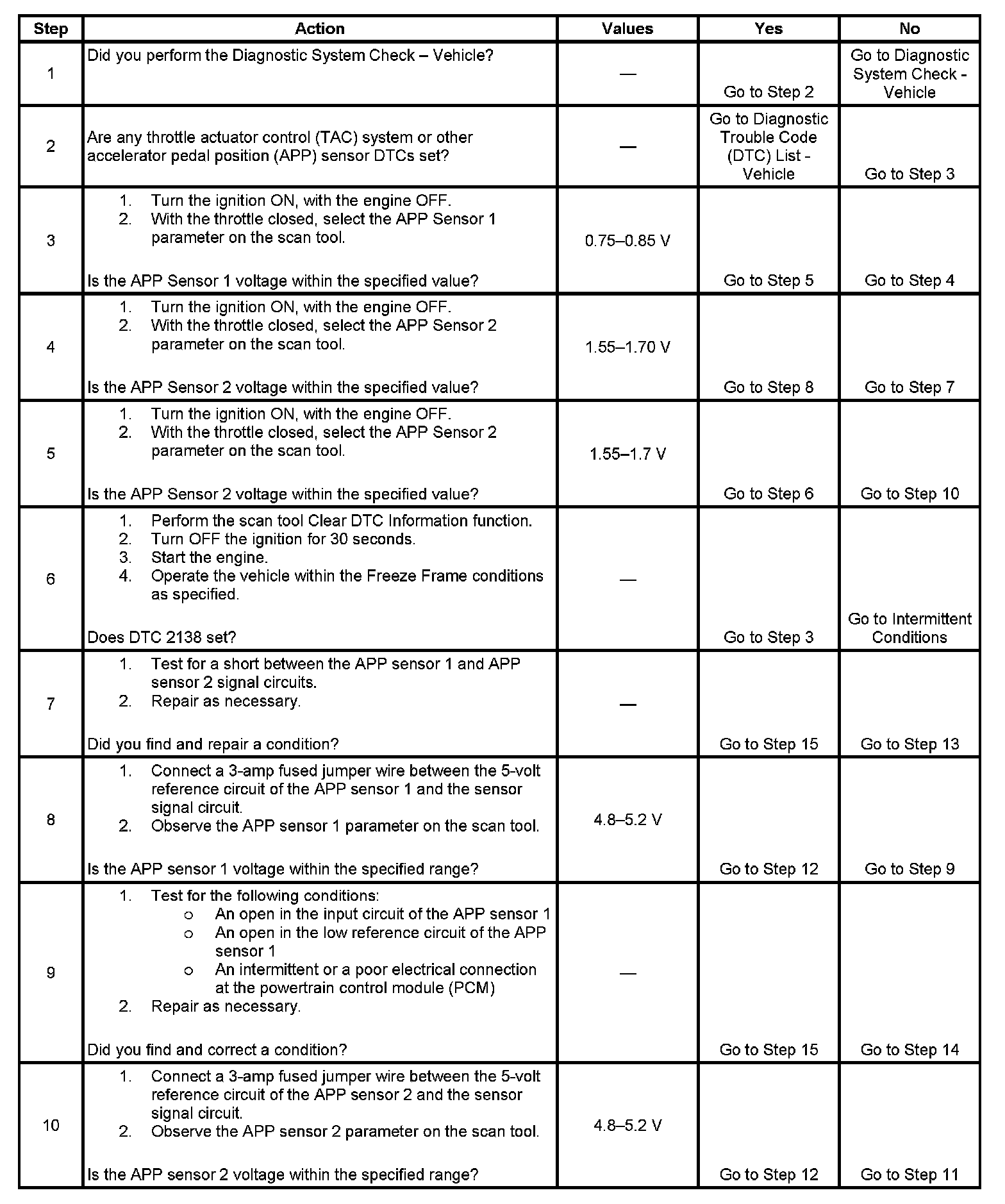 - The difference between the APP sensor 1 signal and the APP sensor 2 signal is less than 0.2 volt for at least 2 seconds.