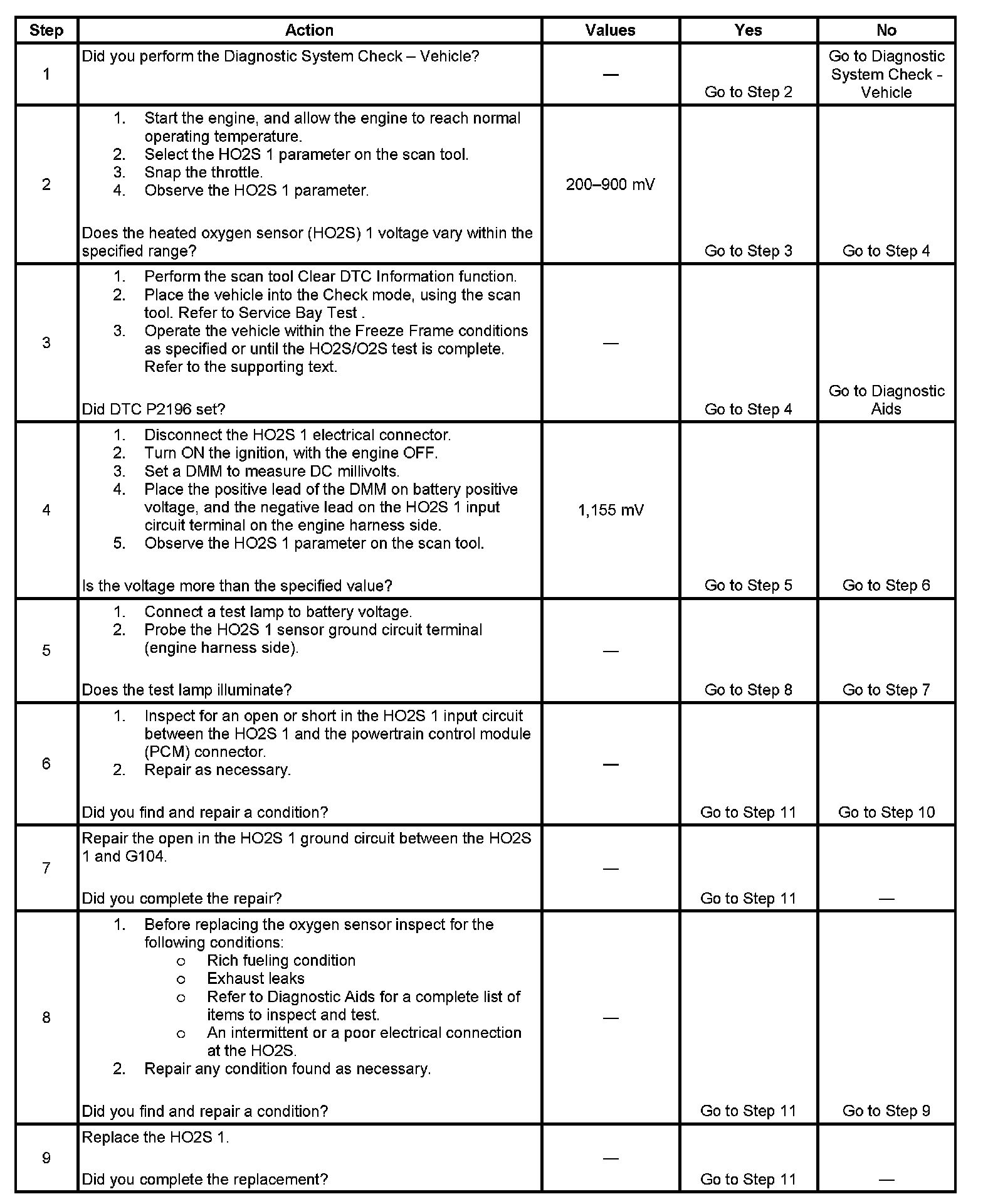 - If a DTC P2196 is intermittent, driving the vehicle under the conditions outlined in the Inspection/Maintenance (I/M) section can verify whether the fault is present. Refer to Inspection/Maintenance (I/M) Heated Oxygen Sensor/Oxygen Sensor (HO2S/O2S) System Set Procedure. Heated Oxygen Sensor/Oxygen Sensor (HO2S/O2S) System Set Procedure