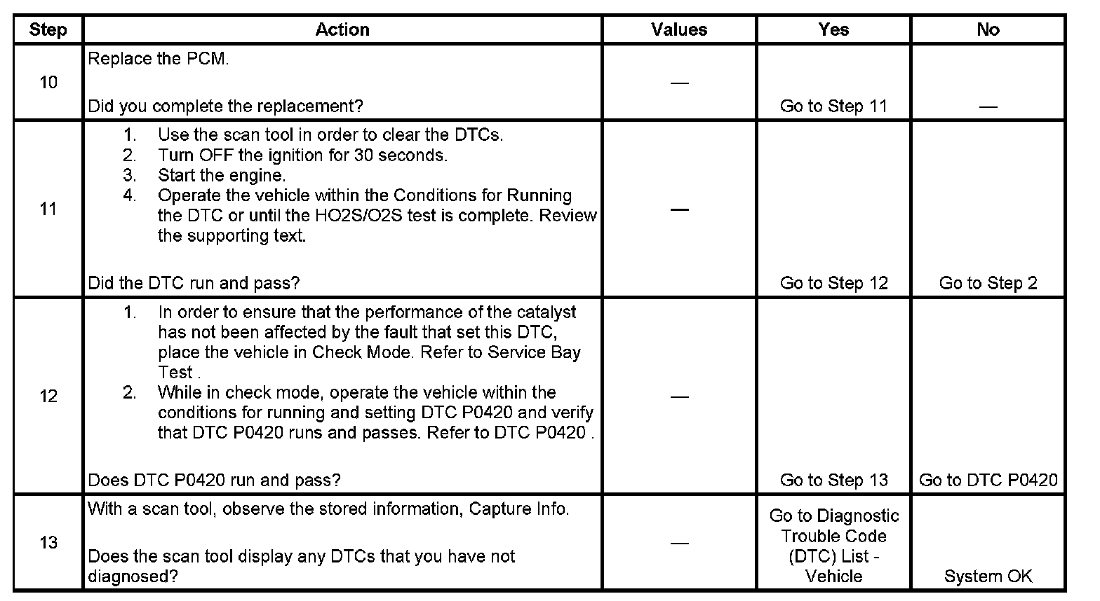 12. Operating the vehicle in Check Mode enhances the diagnostic capabilities of the PCM. The catalytic converter diagnostic can be monitored on the scan tool under the I/M System Information selection. When the Catalyst test displays a YES status, indicating that the catalytic converter system diagnostic is completed, check for DTC P0420 in the Last Test Failed screen of the scan tool. If there is no DTC P0420 displayed, the catalytic converter diagnostic has run and passed, indicating that no malfunction was present this time. The DTCs MUST be cleared in order to view the Current Status of the system diagnostics being performed. Do not forget that the I/M System Information tests only indicate that the test has run, not whether the test passed or failed. The Last Test Failed screen must be checked for related DTCs in order to determine the outcome of the diagnostic test involved.