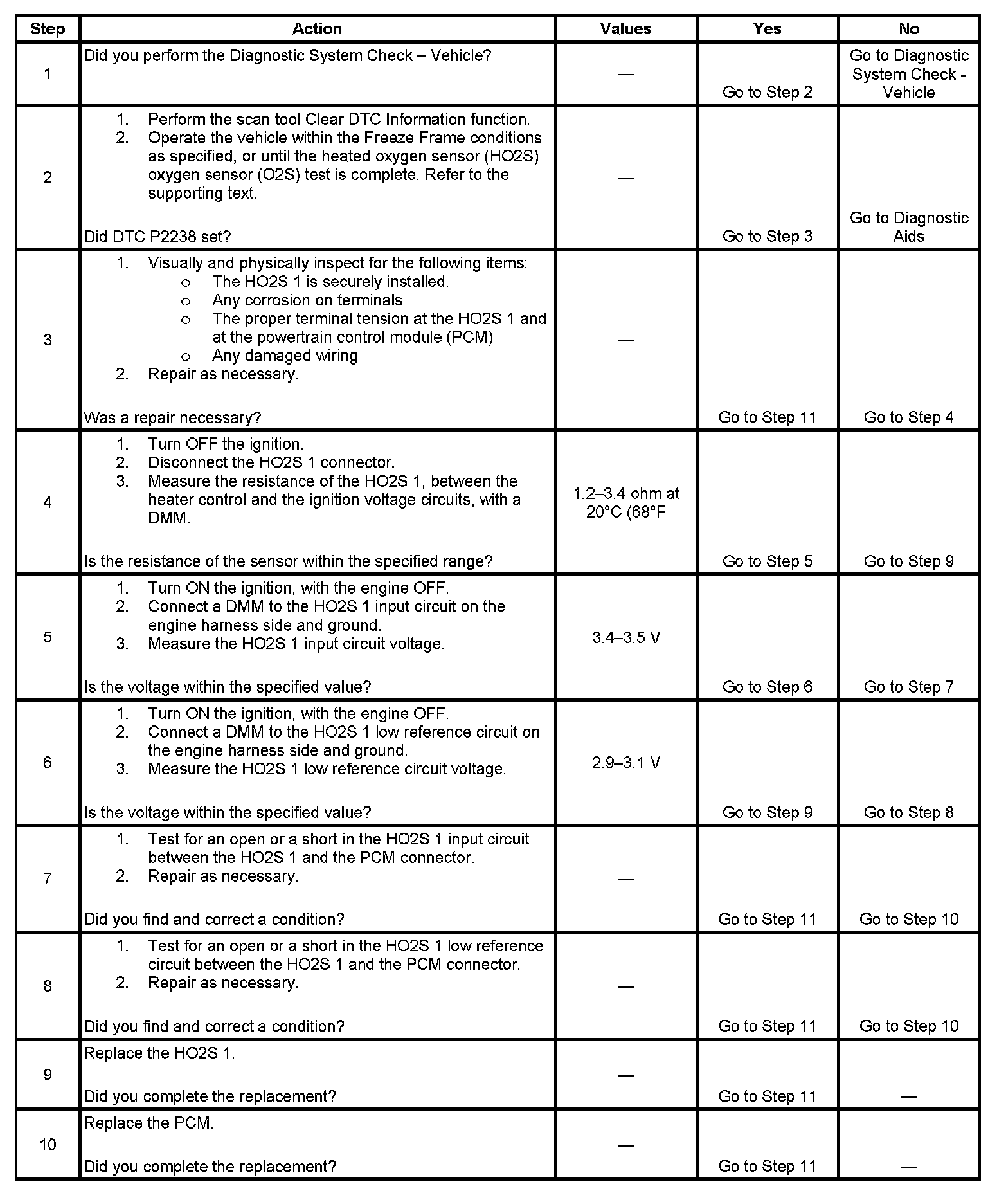 2. This step checks whether the malfunction that caused the DTC P2238 is still present. The HO2S 1 diagnostic can be monitored on the scan tool under the I/M System Information. When the HO2S test displays a YES status, indicating that the heated oxygen sensor system diagnostic is completed, check for a DTC P2238 in the Last Test Failed screen of the scan tool. If there is no DTC P2238 displayed the HO2S diagnostic has run and passed, indicating that no malfunction was present this time. The DTCs MUST be cleared in order to view the Current Status of the system diagnostics being performed. Do not forget that the I/M System Information tests only indicate that the test has run, not whether the test passed or failed. The Last Test Failed screen must be checked for related DTCs in order to determine the outcome of the diagnostic test involved.