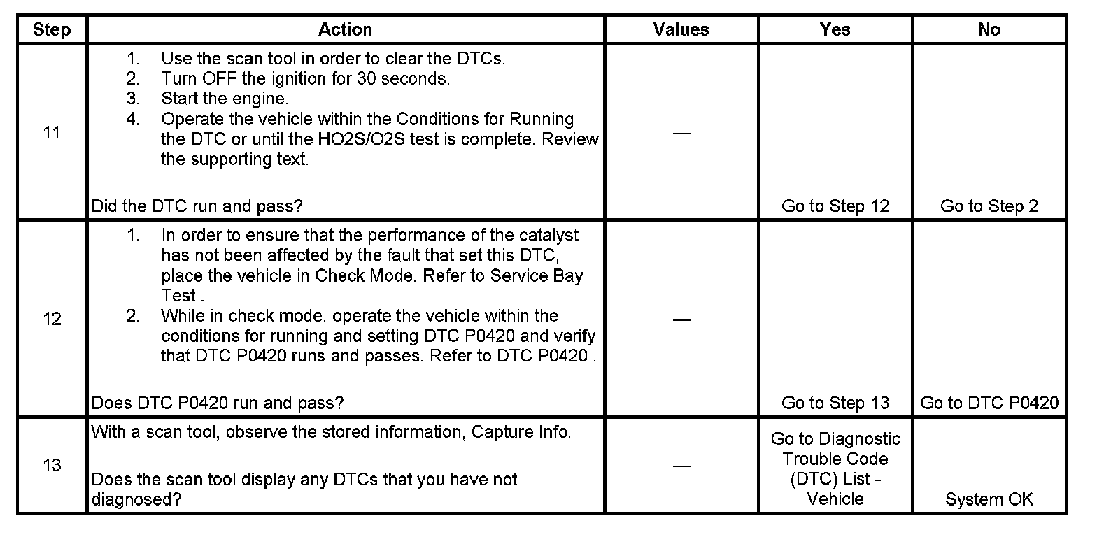 12. Operating the vehicle in Check Mode enhances the diagnostic capabilities of the PCM. The catalytic converter diagnostic can be monitored on the scan tool under the I/M System Information selection. When the Catalyst test displays a YES status, indicating that the catalytic converter system diagnostic is completed, check for DTC P0420 in the Last Test Failed screen of the scan tool. If there is no DTC P0420 displayed, the catalytic converter diagnostic has run and passed, indicating that no malfunction was present this time. The DTCs MUST be cleared in order to view the Current Status of the system diagnostics being performed. Do not forget that the I/M System Information tests only indicate that the test has run, not whether the test passed or failed. The Last Test Failed screen must be checked for related DTCs in order to determine the outcome of the diagnostic test involved.