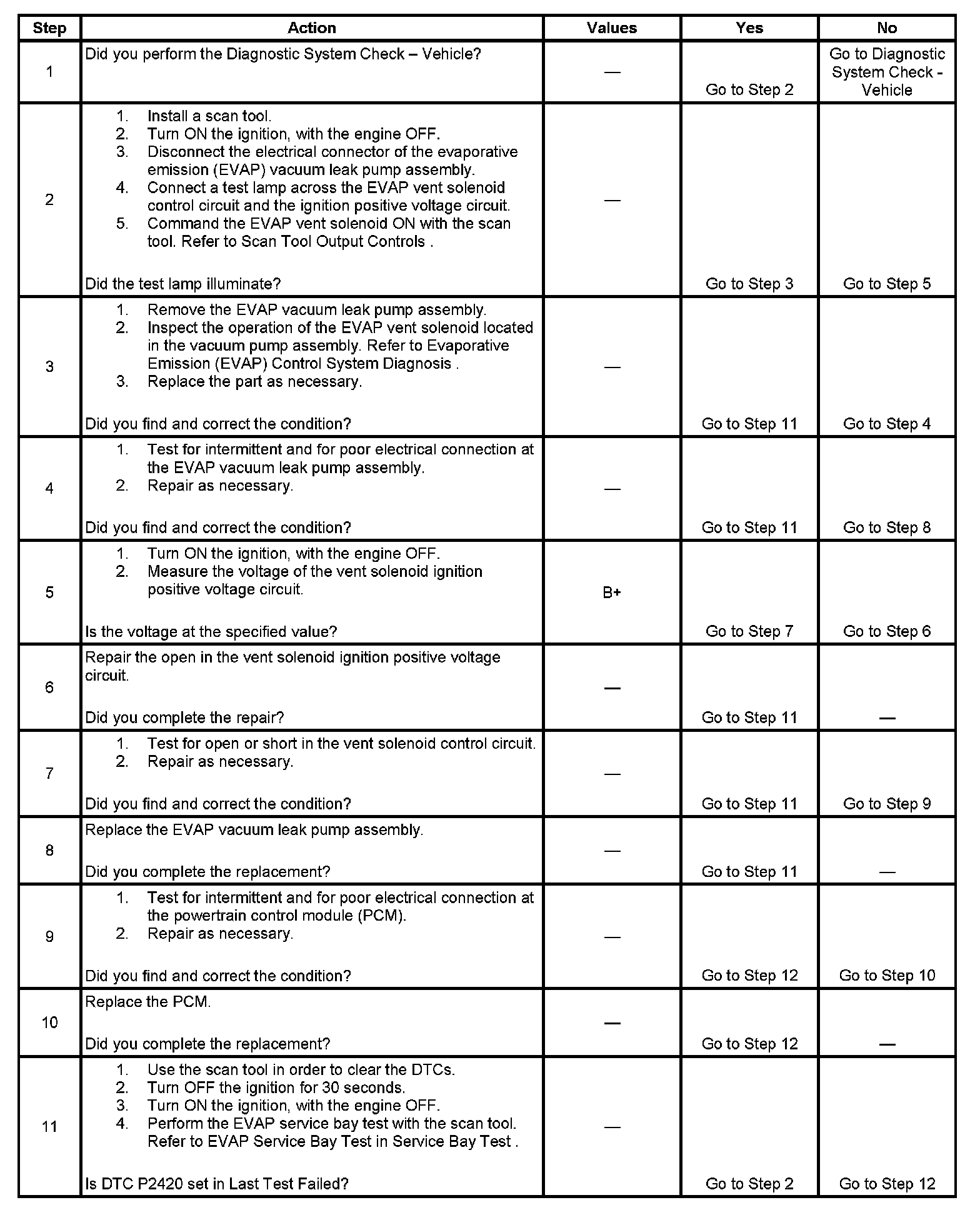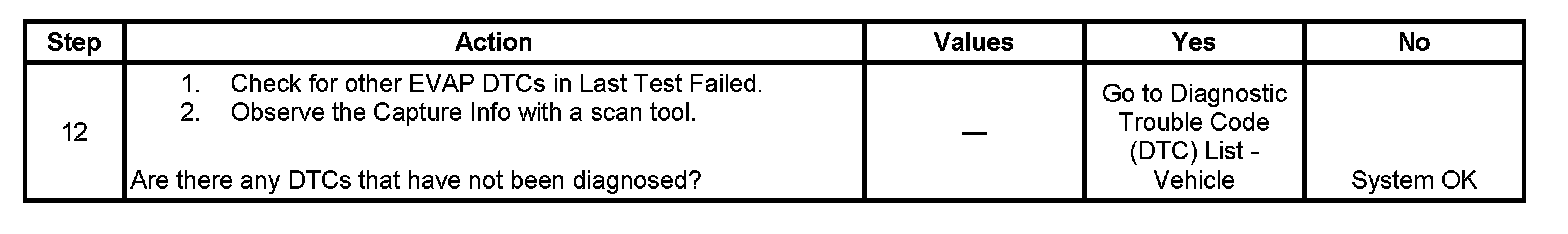 11. This step uses the EVAP Service Bay test in order to verify the correct operation of the EVAP vent solenoid, the EVAP purge solenoid, and the EVAP vacuum leak pump. Using the Service Bay test also tests for leaks by sealing the system and monitoring the FTP sensor.