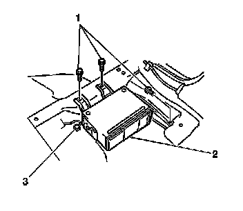 1. Secure the compact disc player (2) to the vehicle with the 3 bolts (1).