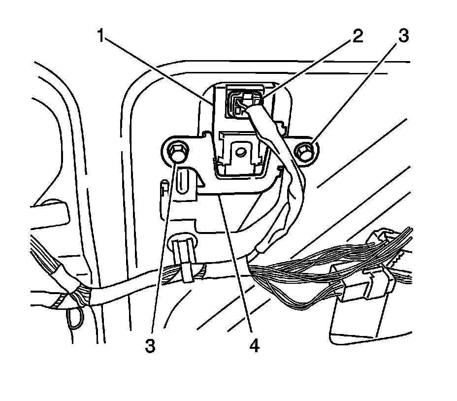 16. Remove rear wiper relay (1) and bracket (4) from lift gate.