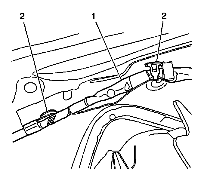 3. Install the upper lift gate harness (1) with retainers (2) to the left inner quarter panel.