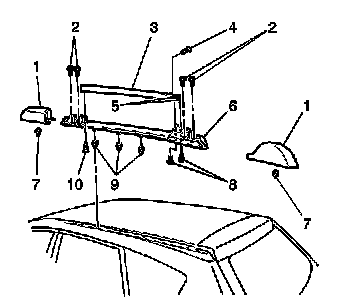 1. Install the luggage carrier side rail (6) to the roof, push down until the 3 plastic retainers (9) engage.