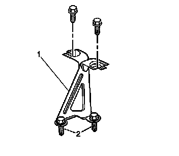 1. Install the rear seat back cushion center pivot support (1) to the vehicle. Secure the support with the 2 bolts (2).