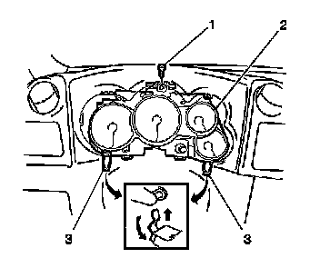 2. Install the cluster assembly (2) to the instrument panel assembly. Secure the assembly with the screw (1) and the 2 clips (3).