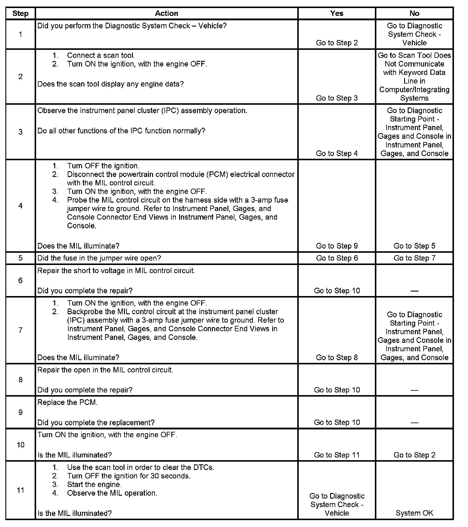 4. This step checks for an open MIL control circuit or for an internal PCM failure.