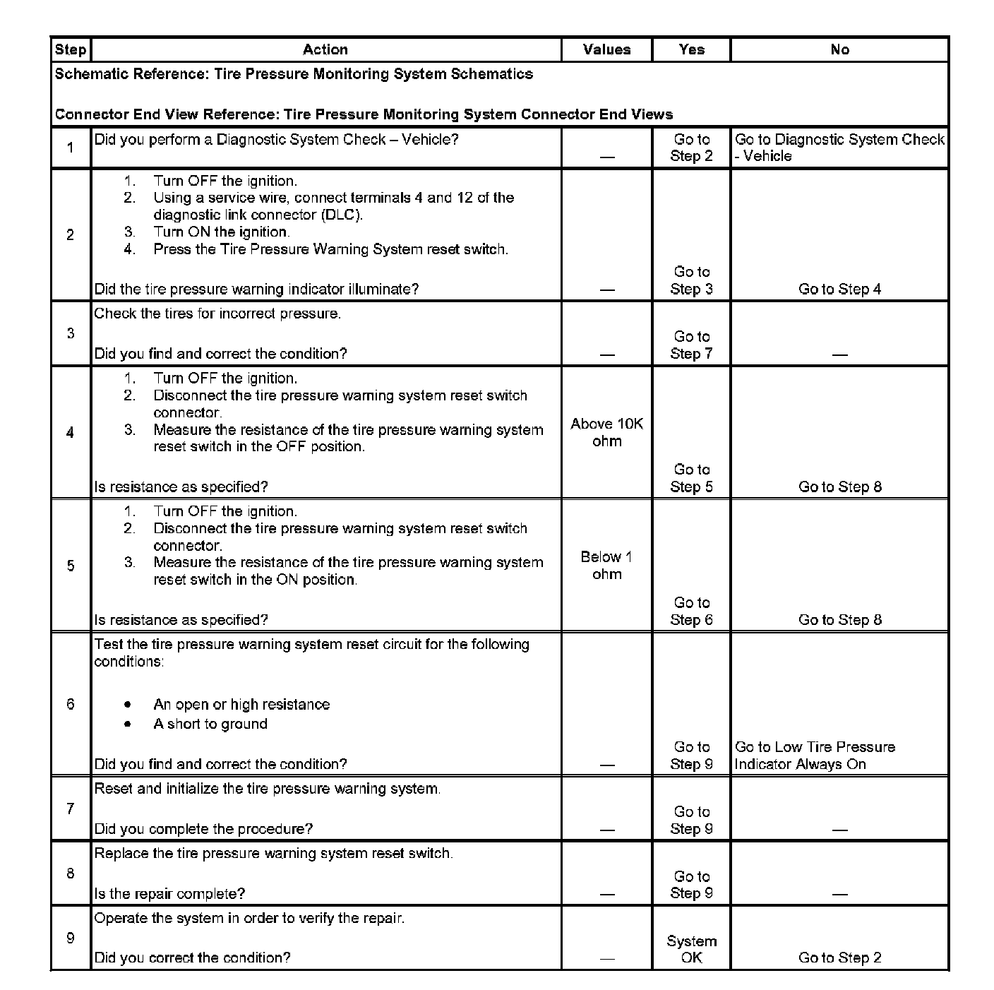 ^ An open, high resistance, or short to ground in the tire pressure warning Indicator reset circuit