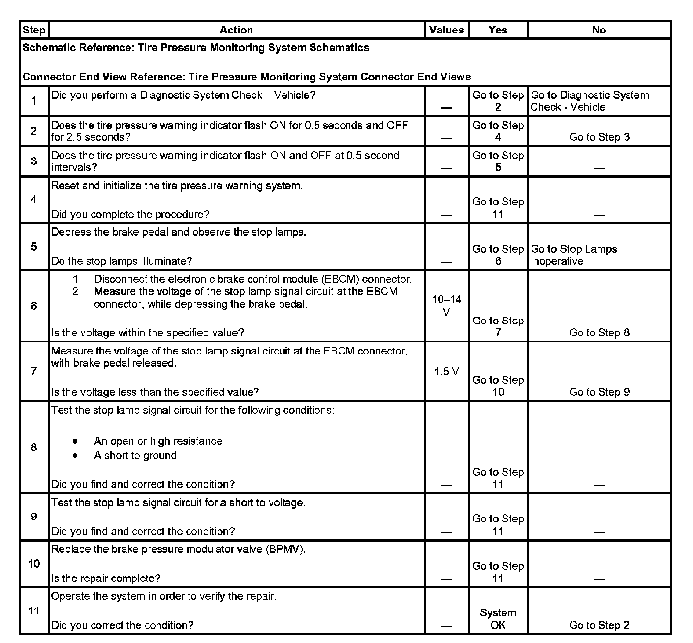 The electronic brake control module (EBCM) turns ON the tire pressure warning indicator by opening the tire pressure warning indicator control circuit. The tire pressure warning indicator is connected to the GAUGE fuse. This circuit has power when the ignition switch is in the ON or START positions. When the ignition switch is turned to the ON position, the EBCM turns ON the tire pressure warning indicator for 3�4 seconds for a bulb check. If the EBCM detects a malfunction, the tire pressure warning indicator will stay ON to warn the driver that the tire pressure warning system is disabled and needs service.