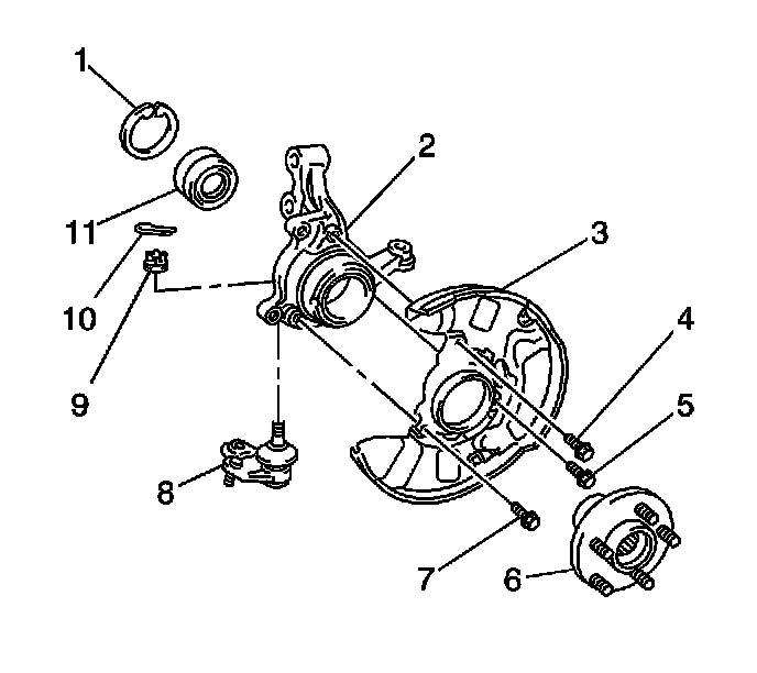 4. Use a press in order to remove the hub from the wheel bearing (11).Press from the inside end of the hub toward the outside of the hub.