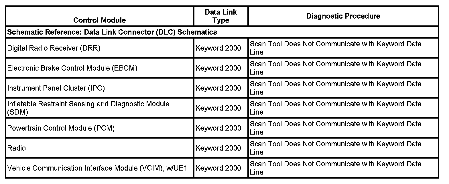 This table identifies which serial data link that a particular module uses for in-vehicle data transmission. Some modules may use more than one data link to communicate. Some modules may have multiple communication circuits passing through them without actively communicating on that data link. This table is used to assist in correcting a communication malfunction. For the description and operation of these serial data communication circuits refer to Data Link Communications Description and Operation.