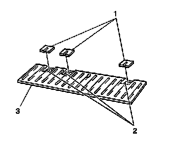 The vehicle is also equipped with a lower child seat anchor bracket (3) for each rear seat position. The lower brackets (3) are located below the rear seat back cushion (1), behind the rear seat cushion (2).