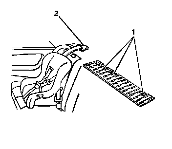 If the child seat has a top strap (2) it must be anchored to one of the upper anchor brackets (1). If the child seat has a bottom strap it must be anchored to one of the lower anchor brackets.
