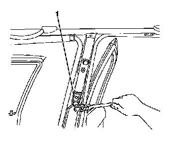 1. Install the front seat shoulder belt retractor tension adjuster (1) to the vehicle. Secure the adjuster with the bolt.
