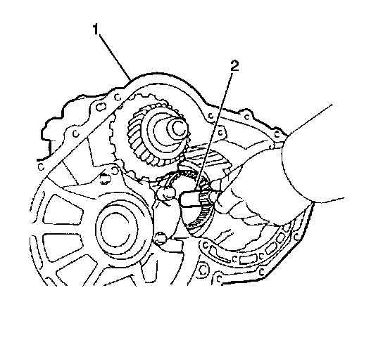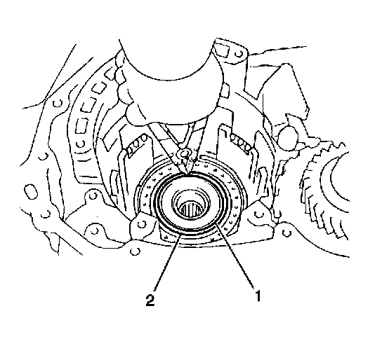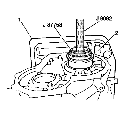 1. Install the countershaft drive gear outer race (2) into the transaxle case (1) using a J 37758 with a J 8092 and a hydraulic press.