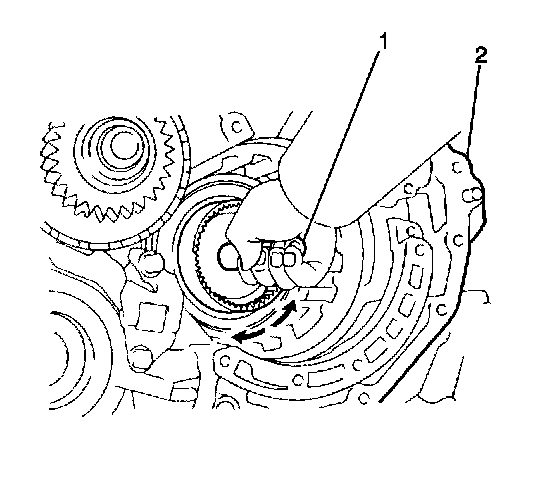 2. Install the countershaft drive gear outer race snap ring (1) onto the countershaft drive gear outer race (2).