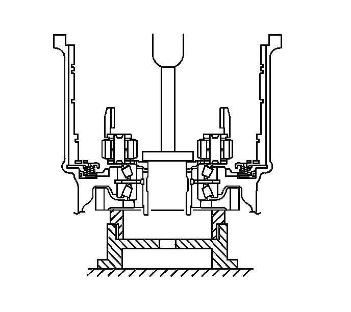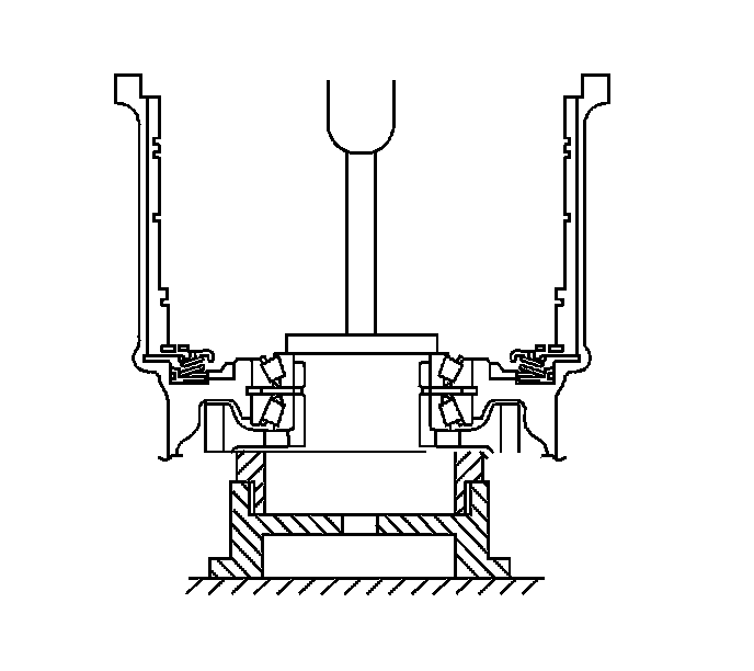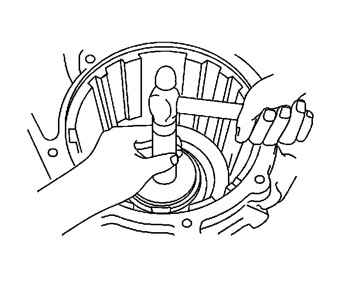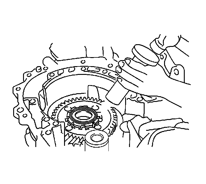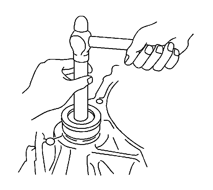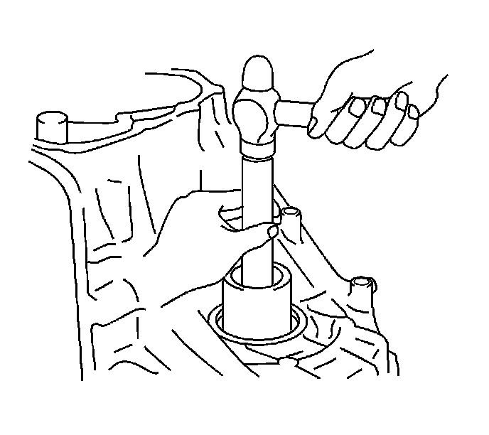 121. Using a bearing driver and hammer, install the front drive pinion rear tapered roller bearing into the transaxle case.