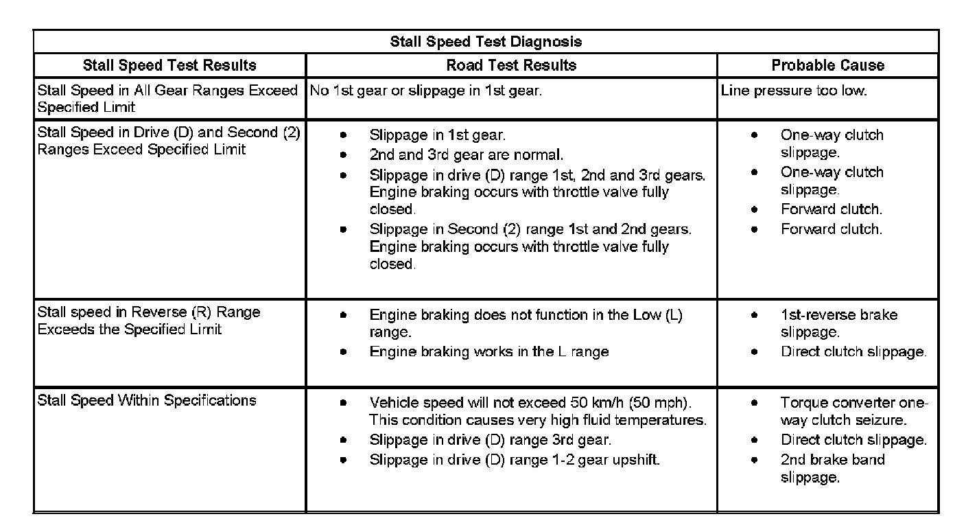The stall speed should fall within 2400 to 2700 RPM in all tested gear ranges. Refer to the Stall Speed Test Diagnosis for causes of higher or lower stall speed.