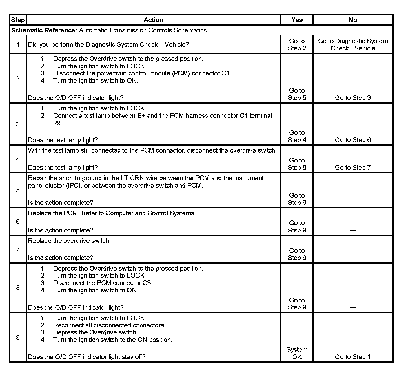 3. This step checks whether the condition is caused by a short to ground or a constantly closed Overdrive switch and not due to a faulty PCM.