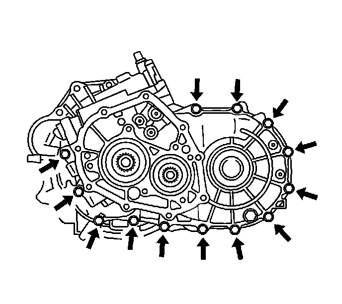 74. Install the 13 transaxle case retaining bolts.