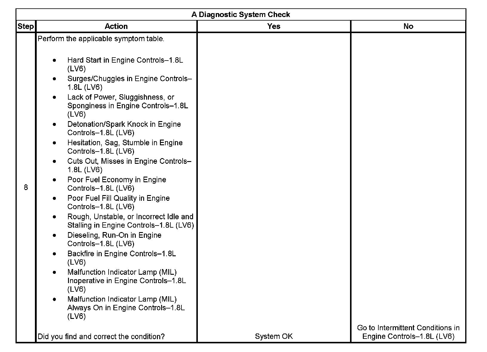 The Diagnostic System Check-Engine Controls is an organized approach to identifying a condition that is created by a malfunction in the engine control system. The Diagnostic System Check must be the starting point for any driveability concern. The Diagnostic System Check directs the service technician to the next logical step in order to diagnose the concern. Understanding and correctly using the diagnostic table reduces diagnostic time and prevents the replacement of good parts.