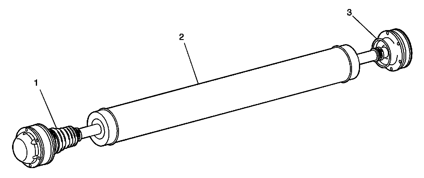 The propeller shaft assembly consists of a 1-piece aluminum tube (2) and front and rear constant velocity type joints (1 and 3). The rear constant velocity joint (1) is a plunging type design and will plunge forward and rearward as required. Dust boots, at each joint, contain the joint lubricating grease and protect the components from dirt and debris. The propeller shaft assembly is retained to the transfer case output flange and the rear differential input flange by retaining bolts.