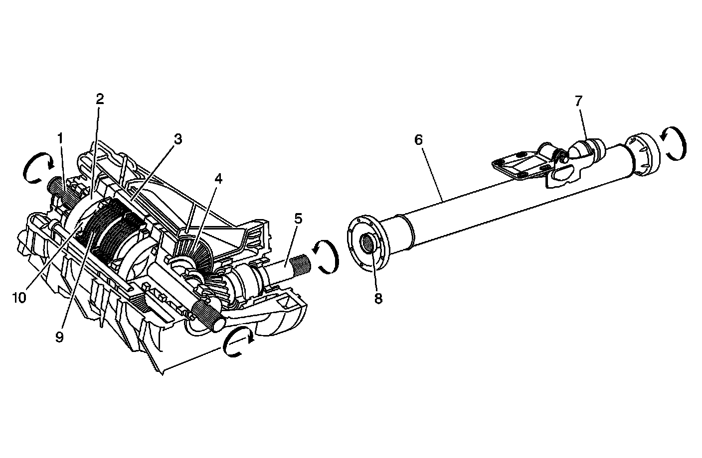 The Versatrak(r) on-demand system operates as follows: The propeller shaft assembly, mated to the output flange of the transfer case, is constantly rotating and spins at a rate equal to an average of the 2 front wheels. Under normal straight-ahead non-slip driving conditions, the external (2) and internal (10) gears of the differential gerotor pumps are rotating at an equal rate of speed. Under those conditions, there is no speed differential between the pump gears, no pump pressure created, no clutch pack activation, and no torque transfer. During a front-wheel slip condition, the external gears (2) of the gerotor pumps rotate at a faster rate of speed than the rear-wheel driven internal gears (10). The gerotor pumps pull oil from the sump through the clutch pump check valve sending pressurized oil to each individual piston to activate the separate clutch packs. On-demand torque/drive is provided to each of the rear wheels as required. A valve internal to each piston housing controls maximum clutch pack pressure. A second valve within each housing is temperature compensating and controls fluid flow based on ambient temperature. The system operates in both forward and rearward vehicle directions.
