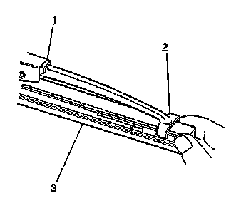 1. Straighten the left wiper tabs (2) until the windshield wiper element can slide freely.