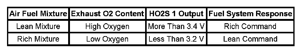 The heated oxygen sensor (HO2S) 1 is a wide band or wide range design. As with all oxygen sensors, the wide band HO2S measures the amount of oxygen in the exhaust system, but provides more information than the typical switching style HO2S. The wide band sensor consists of an oxygen sensing cell, an oxygen pumping cell, and a heater. The exhaust gas sample passes through a diffusion gap between the sensing cell and the pumping cell. The powertrain control module (PCM) supplies a voltage to the HO2S and uses this voltage as a reference to the amount of oxygen in the exhaust system. An electronic circuit within the PCM controls the pump current through the oxygen pumping cell in order to maintain a constant voltage in the oxygen sensing cell. The PCM monitors the voltage variation in the sensing cell and attempts to keep the voltage constant by increasing or decreasing the amount of current flow, or oxygen ion flow, to the pumping cell. By measuring the amount of current required to maintain the voltage in the sensing cell, the PCM can determine the concentration of oxygen in the exhaust. The HO2S input signal is displayed as a voltage within the range of 1-5 volts, with a steady value of 3.2-3.3 volts equal to the air fuel ratio of 14.7:1. If the HO2S 1 input voltage is lower than the specified reference voltage, the PCM determines that the air/fuel ratio is richer than the theoretical air/fuel ratio and reduces the fuel. If the input voltage from the HO2S 1 is higher than the specified reference voltage, the PCM determines that the air/fuel ratio is leaner and increases the fuel. By repeating these operations, the PCM can adjust the air/fuel ratio in order to be closer to the theoretical air/fuel ratio. Control of the fuel delivery system as just described is known as Closed Loop operation.