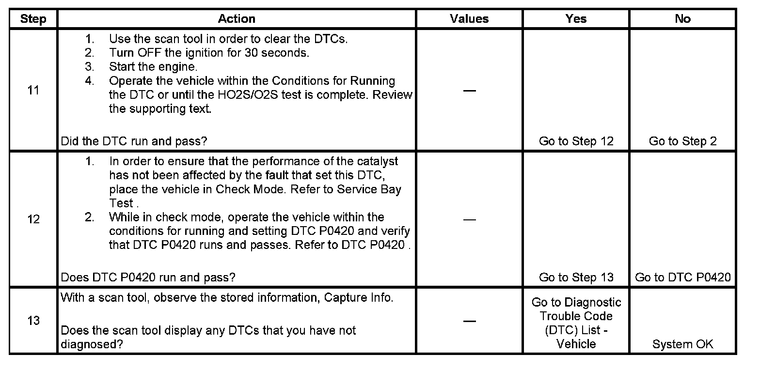 12. Operating the vehicle in Check Mode enhances the diagnostic capabilities of the PCM. The catalytic converter diagnostic can be monitored on the scan tool under the I/M System Information selection. When the Catalyst test displays a YES status, indicating that the catalytic converter system diagnostic is completed, check for DTC P0420 in the Last Test Failed screen of the scan tool. If there is no DTC P0420 displayed, the catalytic converter diagnostic has run and passed, indicating that no malfunction was present this time. The DTCs MUST be cleared in order to view the Current Status of the system diagnostics being performed. Do not forget that the I/M System Information tests only indicate that the test has run, not whether the test passed or failed. The Last Test Failed screen must be checked for related DTCs in order to determine the outcome of the diagnostic test involved.