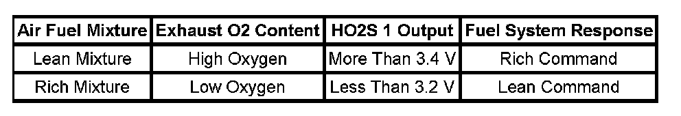 The heated oxygen sensor (HO2S) 1 is a wide band or wide range design. As with all oxygen sensors, the wide band HO2S measures the amount of oxygen in the exhaust system, but provides more information than the typical switching style HO2S. The wide band sensor consists of an oxygen sensing cell, an oxygen pumping cell, and a heater. The exhaust gas sample passes through a diffusion gap between the sensing cell and the pumping cell. The powertrain control module (PCM) supplies a voltage to the HO2S and uses this voltage as a reference to the amount of oxygen in the exhaust system. An electronic circuit within the PCM controls the pump current through the oxygen pumping cell in order to maintain a constant voltage in the oxygen sensing cell. The PCM monitors the voltage variation in the sensing cell and attempts to keep the voltage constant by increasing or decreasing the amount of current flow, or oxygen ion flow, to the pumping cell. By measuring the amount of current required to maintain the voltage in the sensing cell, the PCM can determine the concentration of oxygen in the exhaust. The HO2S input signal is displayed as a voltage within the range of 1-5 volts, with a steady value of 3.2-3.3 volts equal to the air fuel ratio of 14.7:1. If the HO2S 1 input voltage is lower than the specified reference voltage, the PCM determines that the air/fuel ratio is richer than the theoretical air/fuel ratio and reduces the fuel. If the input voltage from the HO2S 1 is higher than the specified reference voltage, the PCM determines that the air/fuel ratio is leaner and increases the fuel. By repeating these operations, the PCM can adjust the air/fuel ratio in order to be closer to the theoretical air/fuel ratio. Control of the fuel delivery system as just described is known as Closed Loop operation.