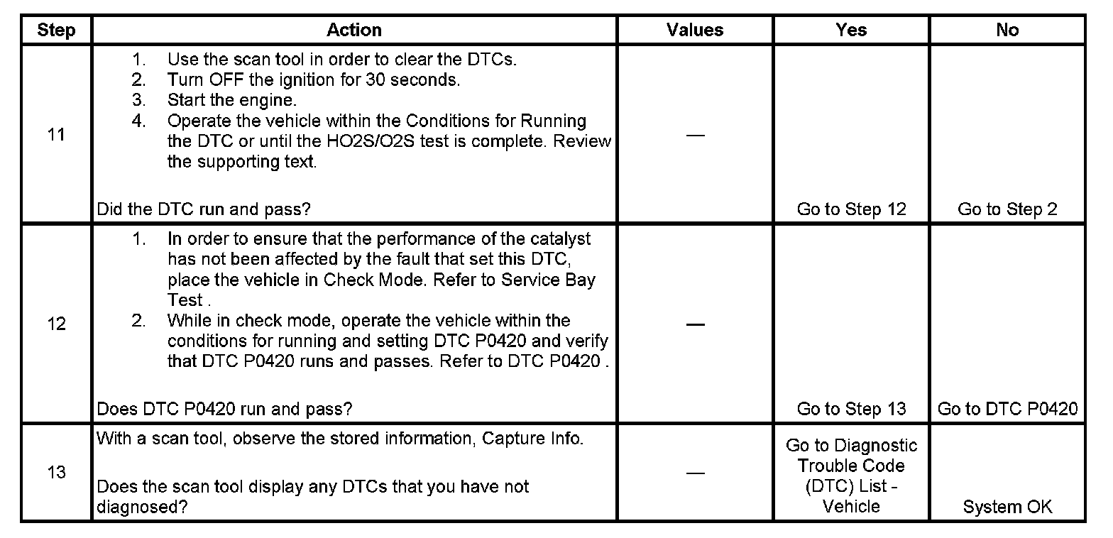 12. Operating the vehicle in Check Mode enhances the diagnostic capabilities of the PCM. The catalytic converter diagnostic can be monitored on the scan tool under the I/M System Information selection. When the Catalyst test displays a YES status, indicating that the catalytic converter system diagnostic is completed, check for DTC P0420 in the Last Test Failed screen of the scan tool. If there is no DTC P0420 displayed, the catalytic converter diagnostic has run and passed, indicating that no malfunction was present this time. The DTCs MUST be cleared in order to view the Current Status of the system diagnostics being performed. Do not forget that the I/M System Information tests only indicate that the test has run, not whether the test passed or failed. The Last Test Failed screen must be checked for related DTCs in order to determine the outcome of the diagnostic test involved.