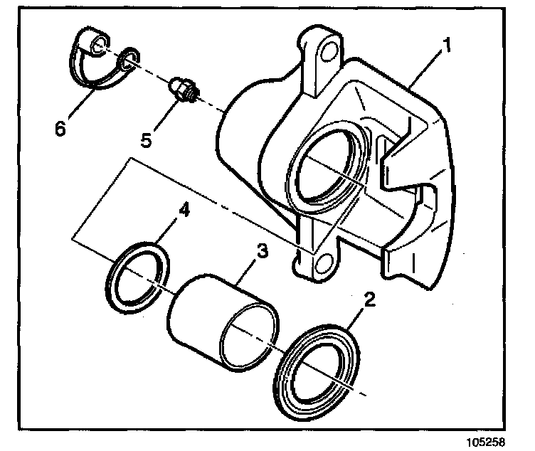 1. Inspect the brake caliper housing (1) for cracks, excess wear, and/or damage. If any of these conditions are present, the brake caliper requires replacement.