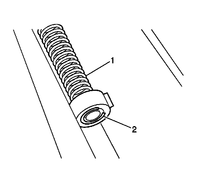 3. Compress the assembly spring (1) and remove the E-clip (2) from the guide post of the fuel sender assembly upper support.