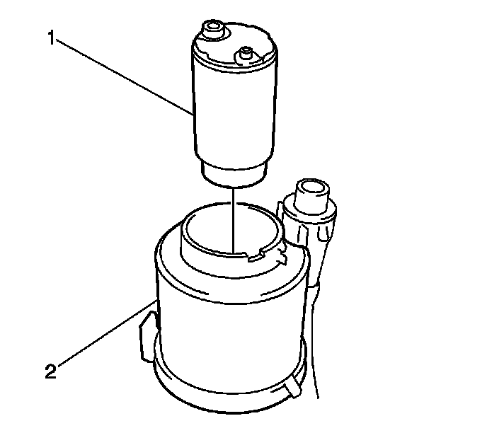 6. Separate the upper support and fuel pump filter assembly (1) from the lower housing (2).